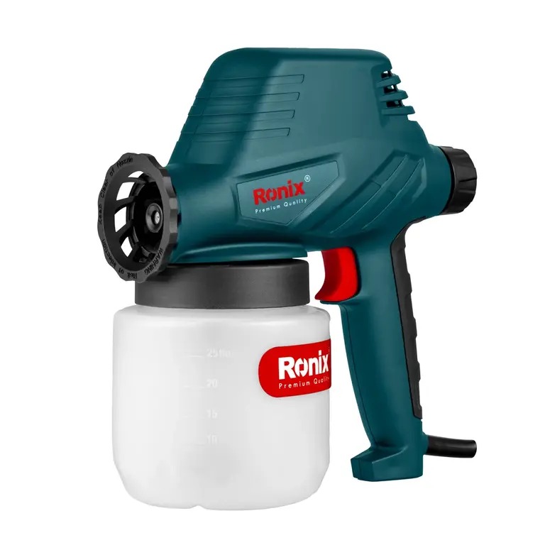 مجموعه عملکرد نازل و موتور پرقدرت پیستوله برقی 1311 رونیکس، حداکثر جریان 300 میلیلیتر بر دقیقه را با ویسکوزیته 60 دین بر ثانیه ایجاد میکند. دکمه کنترل جریان در این پیستوله برقی، میزان خروجی مواد را با توجه به پروژه مورد نظر تنظیم میکند.