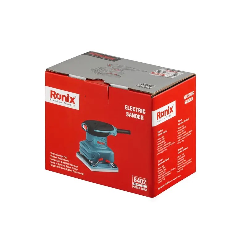 سنباده لرزان 6402 رونیکس، دارای موتوری پرقدرت با دور بالا و توان 220 وات است که قابلیت ایجاد 15000 لرزش بر دقیقه را دارد. ازآنجاییکه از این دستگاه در کارگاههای نجاری استفاده میشود، در طراحی آن از بلبرینگها و کلید ضد غبار استفاده شده تا با جلوگیری از ورود گرد و غبار و تراشههای چوب به داخل دستگاه، موجب افزایش طول عمر آن شود.